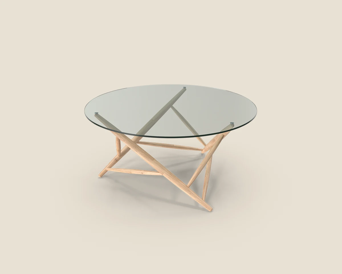 The Axis Table combines a sleek glass top with a unique geometric wooden base, bringing modern style and structural elegance to any space.