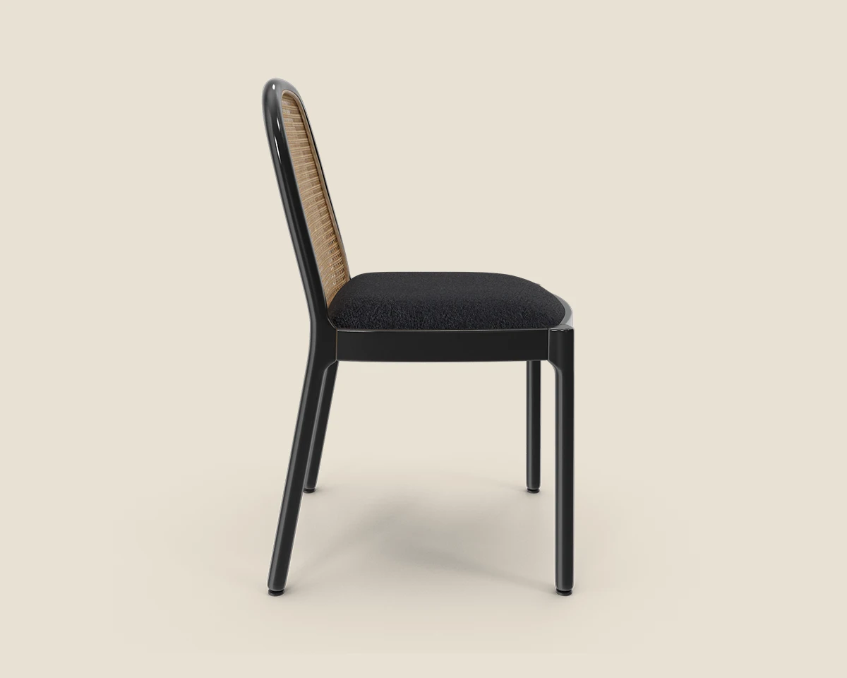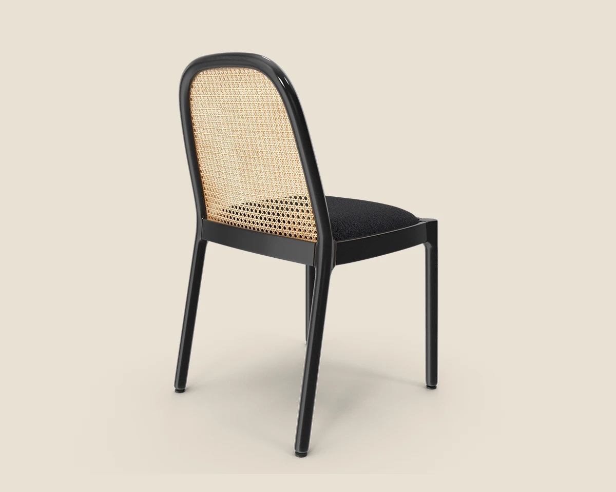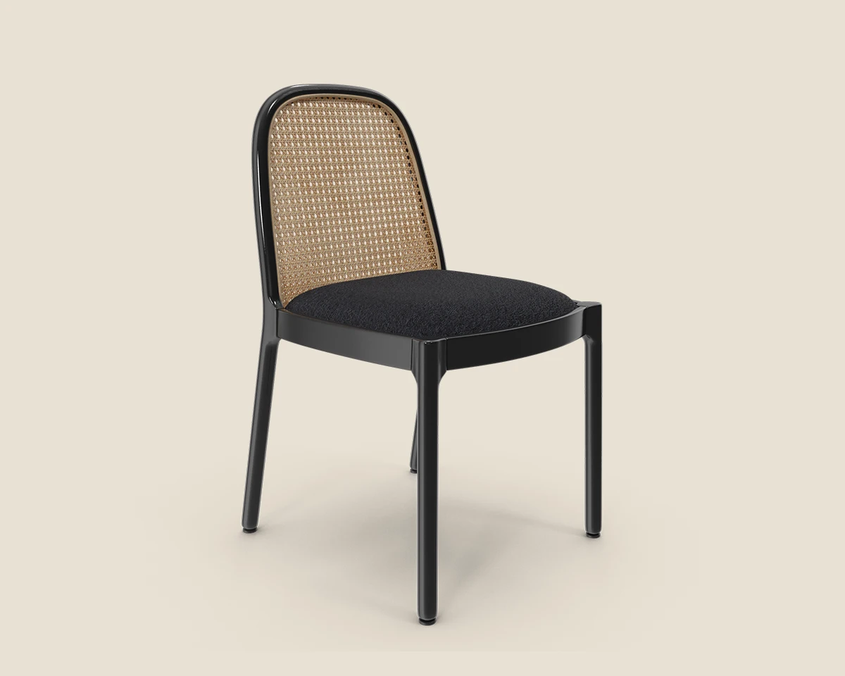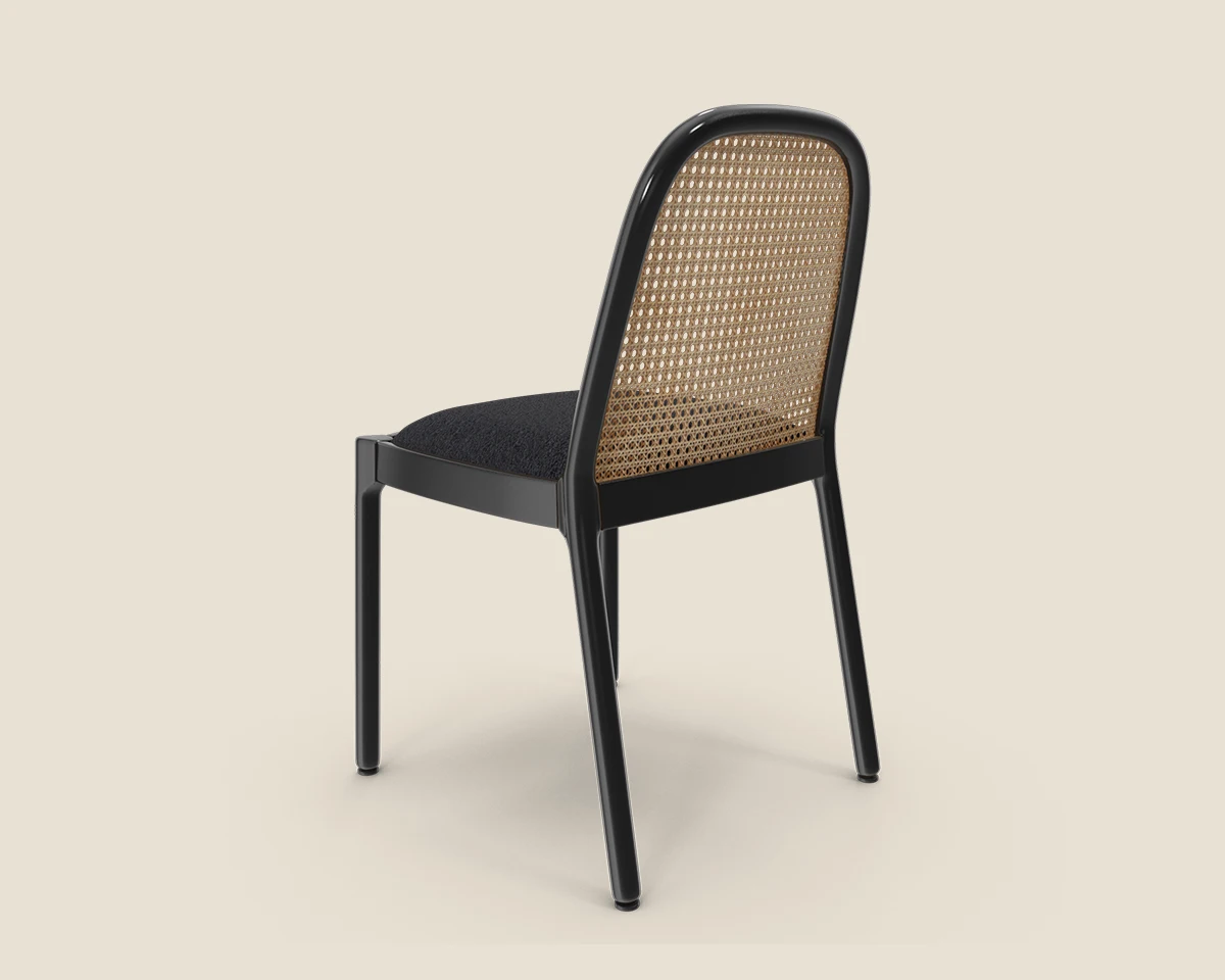 A modern chair with a woven cane backrest and padded seat, blending style and comfort for contemporary interiors.